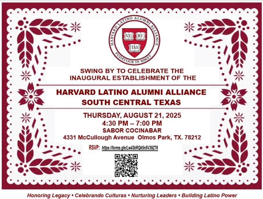 ¡Felicidades y bienvenidos! The Harvard Latino Alumni Alliance officially welcomes the South-Central Texas (SCT) regional leadership! Join us as we appreciate you forwarding our announcement to your membership to RSVP as we celebrate the inaugural establishment of the: