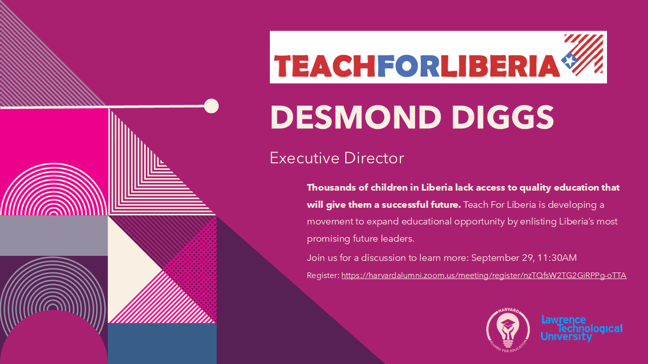 Thousands of children in Liberia lack access to quality education that will give them a successful future. Teach For Liberia is developing a movement to expand educational opportunity by enlisting Liberia’s most promising future leaders. Join us to discuss their important work.