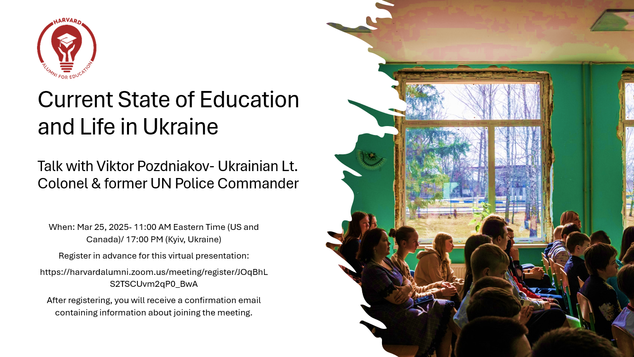 Harvard Alumni for Education (HAEd) hosts Viktor Pozdniakov- Ukrainian Lt. Colonel & former UN Police Commander to share about the current quality of life, education, child protection, and attitudes towards peace accords in Ukraine. Pozdniakov is an expert in policing, justice, and international relations; Lt. Colonel in Ukraine/ Veteran of National Police; with 26 years of police experience, including 8 years of UN experience including command positions in post-conflict countries - Sudan, Liberia and South Sudan. He addresses What is the current situation and quality of life in Ukraine, over 3 years after the start of the full-scale Russian invasion? What is the current state of education for children and universities despite war? What is the current concerns with children affected by the war? What is the current attitude of Ukrainians towards a peace deal with Russia? What does Ukraine need currently to help end the war?
